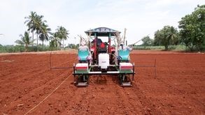 A two-row tractor drawn mechanical planter for sugarcane bud chip settlings raised in protrays has been developed by ICAR-Central Institute of Agricultural Engineering, Regional Station, Coimbatore in collaboration with ICAR-SBI, Coimbatore. This tractor mounted planted considerable reduced the planting cost and resulted in good establishment of the crop. The equipment consists of mainframe to be attached to standard three point hitch arrangement of a 40 hp tractor with adjustable arrangement for altering row to row spacing 90, 120 and 150 cm. Bud chip settlings to be dropped through the metering mechanism by two operators who are seated behind the equipment with adjustable arrangements for altering plant to plant spacing of 30, 45 and 60 cm. Furrow openers open the furrow, in which the settlings with soil are to be planted with adjustable arrangement for altering depth of planting 2 to 6 cm. The same furrow is used for irrigation after the settlings have been planted for better establishment. The furrow closer which follows the soil opener closes the soil thereby giving stability to the settling plants. The field capacity of the equipment is 0.15 ha/h and the missing of 3 to 4per cent at a working speed of 1.4 km/h. The plant establishment was more than 95%. The yield and quality parameters are on par when compared with manual planting.