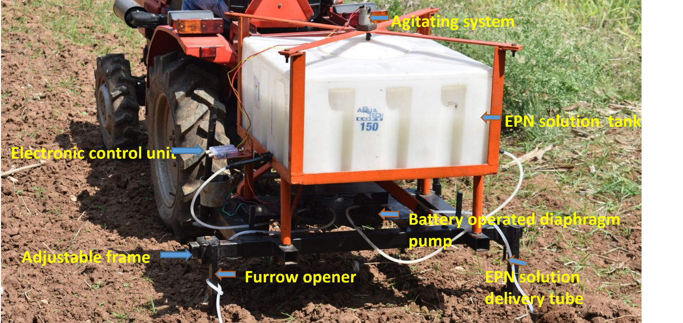 - The small tractor operated EPN applicator consists of main frame, tank holding assembly, agitator, water pump, furrow opener, standard three-point hitch and a 150-liter tank to carry the EPN solution. The tank consists of agitator and two EPN solution outlet flexible tubes. The agitator consists of two numbers of baffles at the end of vertical shaft. The agitator shaft was operated by 12 V high torque DC motor. The agitator provides continues agitation of EPN solution and avoid suspension of particles so that it results in uniform delivery of the EPN. Pumping of EPN solution was done by two numbers of 4.0 LPM / 12v DC Water Sprayer Motor Diaphragm pump.