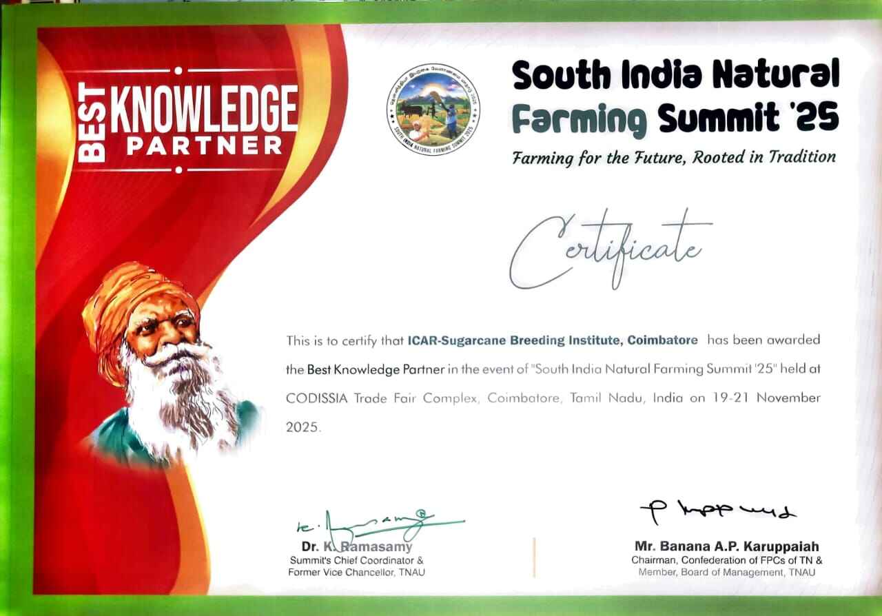 ICAR-SBI award summit 2025 ICAR SBI NEWS ARCHIVE South India Natural Farming Summit 25 ICAR – Sugarcane Breeding Institute, Coimbatore has been awarded the best Knowledge Partner in the event of South India Natural Farming Summit 25 Best stall in the event of South India Natural Farming Summit 25