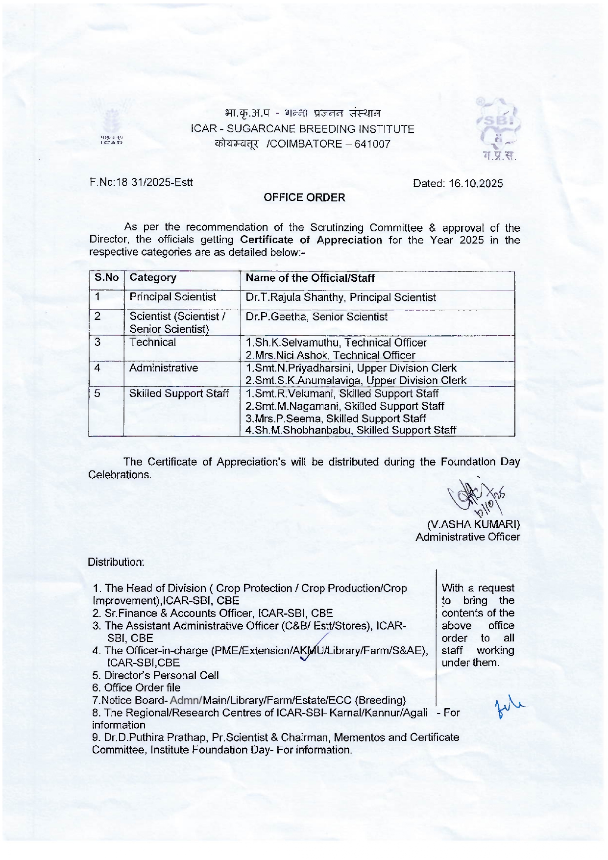 Constitution Day was celebrated on 26.11.2025 at ICAR-Sugarcane Breeding Institute, Coimbatore and its Regional Centre, Karnal and Research Centre, Kannur.